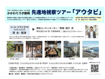 今年度も「アウタビ」を開催致します。一回目は「清水・興津」 清水クロスのマネジメント 興津清々庵の運営をされている牧田さんにアテンドをお願いし先進地事例を学ぶ時間です! また2回目は「天城」3回目は「静岡もくよる」と続きますので どうぞ皆様ご参加くださいませ